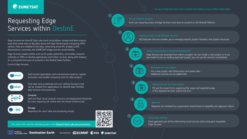 A detailed step-by-step guide to requesting Edge ServicesComputing and storage capabilities provided within the Desti More is given in the DestinE Data Lake online Documentation.